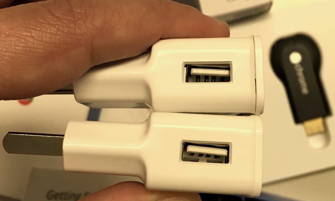 Al abrir ambos Chromecast notamos que los pequeños transformadores tenían el conector para el cable USB torcido. Torcido. ¡LOS DOS!. Y la unión de una de los transformadores era bastante mala. Luego noté que a estos aparatos los ensambla Samsung… ¯\_(ツ)_/¯